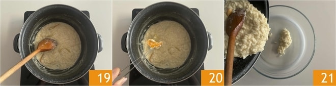 Cocina la crema de arroz durante unos 25-30 minutos a fuego lento, manteniéndola controlada y removiendo de vez en cuando. Al final de la cocción, el arroz habrá absorbido toda la leche 19, así que puedes eliminar las cáscaras 20. En este punto, transfiere la crema de arroz a un bol de vidrio grande 21.
