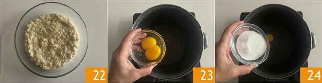 Deja que se enfríe 22 y ocúpate de la crema. En una cacerola, vierte las yemas 23 y el azúcar 24.