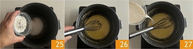 Añade luego el almidón 25 y comienza a mezclarlos con un batidor 26. Luego vierte la leche en un hilo 27.