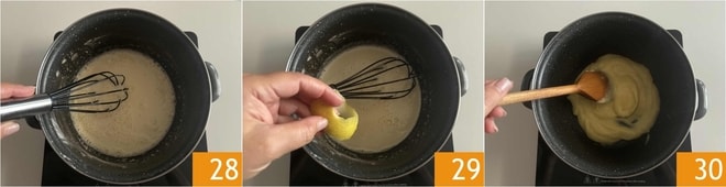 A medida que mezclas con el batidor 28, para no arriesgarte a la formación de grumos, añade también la cáscara de limón 29. En este punto, cocina la crema a fuego lento hasta que se espese 19, tardará unos 10 minutos 30.