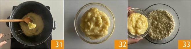 Elimina la cáscara de limón 31 y transfiere también la crema a un bol de vidrio para que se enfríe 32. Cuando la crema esté fría, incorpórala a la crema de arroz 33.