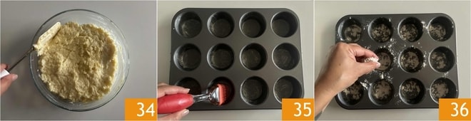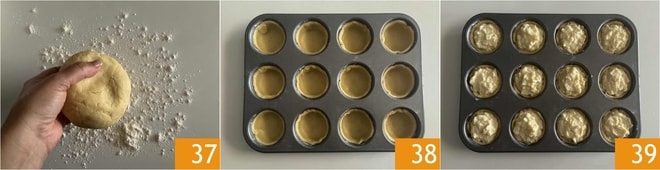 Saca la masa del frigorífico 37, extiéndela sobre la superficie enharinada con la ayuda de un rodillo, a un grosor de aproximadamente 3-4 mm. Corta discos con un cortapastas de 9-10 cm de diámetro aproximadamente. Luego inserta los discos obtenidos dentro del molde 38, haciéndolos adherir bien al borde y al fondo. Rellena los cestos de masa con la crema 39.