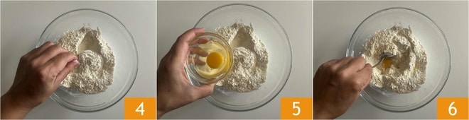 Luego añade la sal 4, el huevo 5 y mezcla todo con una cuchara 6.