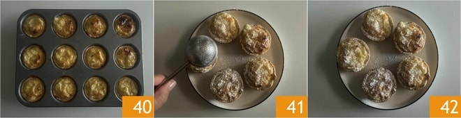 Cocina los pudines de arroz a 180° durante unos 40 minutos en el estante central del horno, usando el horno ventilado, los tiempos pueden variar ligeramente según el horno, evalúa el dorado. Saca del horno los pudines de arroz 40, déjalos enfriar, luego desmóldalos y decóralos con azúcar glas 41. Los pudines de arroz están listos, solo queda servirlos 42.