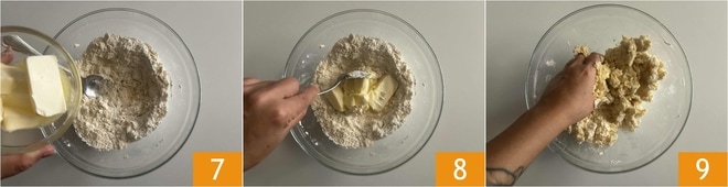Ahora añade la mantequilla 7, mantenida a temperatura ambiente durante al menos diez minutos, y mezcla también eso, primero con la cuchara 8 y luego continúa a mano 9.