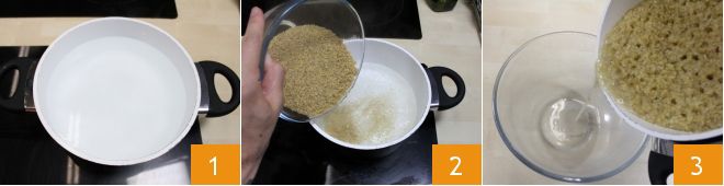 Para realizar el bulgur con pesto de hierbas frescas y nueces, empezad con la preparación del bulgur: lavad el bulgur bajo agua corriente, llevad a ebullición 600 ml de agua 1, salidla y verted el bulgur 2; cocedlo durante aproximadamente 15-20 minutos (o el tiempo indicado en el paquete), transcurrido este tiempo, escurridlo, ponedlo en un bol 3