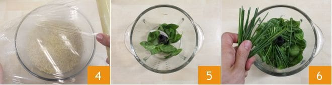 y cubridlo con film transparente 4, reservadlo hasta que se haya templado. El bulgur habrá duplicado su volumen. Dedicaos ahora al pesto: tomad un procesador (si lo preferís también podéis usar un mortero) colocad dentro las hierbas aromáticas previamente lavadas y secadas: la albahaca 5, los tallos de cebollino 6,