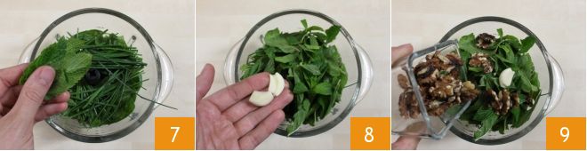 las hojitas de menta 7, el diente de ajo 8 (que podéis omitir si no os gusta), las nueces peladas 9