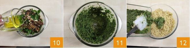 y añadid un chorrito de aceite 10, poned en marcha el procesador y añadid poco a poco más aceite de oliva virgen extra hasta obtener una mezcla casi aterciopelada 11. Ajustad de sal y transferid el pesto al bol que contiene el bulgur mezclando para que el bulgur se impregne con el pesto de hierbas 12.