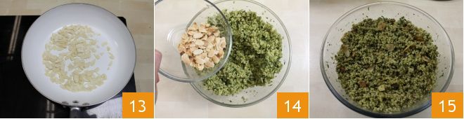 A continuación, tostáis durante unos minutos las almendras en una sartén caliente sin añadir aceite 13, revolviéndolas varias veces para evitar que se quemen. Añadid las almendras tostadas al bulgur y mezclad para obtener una mezcla homogénea. ¡Vuestro bulgur con pesto de hierbas frescas y nueces está listo para ser degustado!