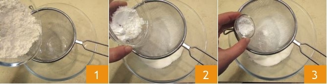 Para preparar la bundt cake, primero tamizad la harina en un bol 1, luego añadid la maicena 2 y la levadura, tamizándolas también 3, añadid una pizca de sal, mezclad y dejad las harinas a un lado.