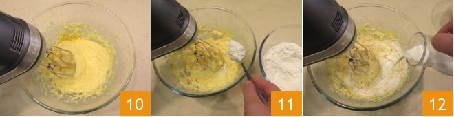 y seguid batiendo hasta incorporarlos completamente 10. En este momento podéis añadir gradualmente las harinas con una cuchara 11 y la leche a temperatura ambiente, en un hilo 12, alternándolos entre ellos, manteniendo siempre las varillas en funcionamiento.