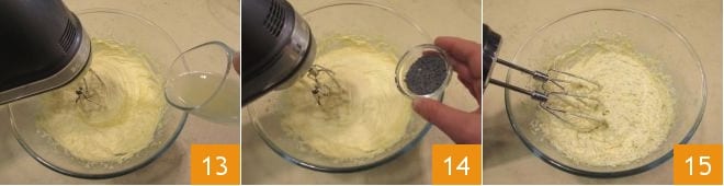 Finalmente añadid 45 g de zumo de limón filtrado 13 y las semillas de amapola 14 y trabajad la mezcla hasta amalgamar bien todos los ingredientes: vuestra masa está lista 15.