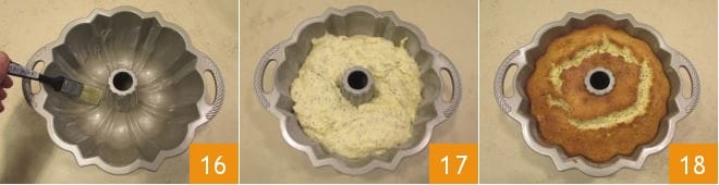 Ahora engrasad 16 y enharinad el molde específico de la bundt cake, de unos 20 cm de diámetro y 9 cm de altura. Llenad el molde con la masa 17 y hornead en el horno estático ya caliente a 170° durante unos 60 minutos; si durante la cocción el pastel se oscureciera demasiado, cubridlo con una hoja de aluminio. Una vez cocido (siempre realizad la prueba del palillo para verificar el grado de cocción), sacad la bundt cake del horno 18 y dejadla enfriar en el molde durante 10-15 minutos,