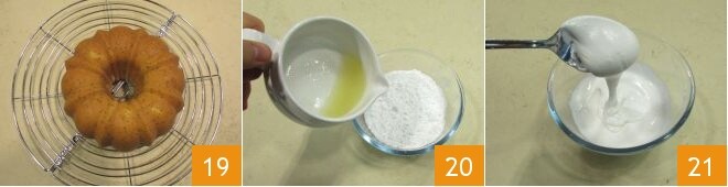 luego dadle la vuelta sobre una rejilla y dejadla enfriar completamente 19. Mientras el pastel se está enfriando, podéis preparar la glasa: verted el azúcar glas en un bol pequeño, añadid el resto del zumo de limón filtrado 20 y mezclad con una cucharita hasta obtener una consistencia densa y homogénea 21.