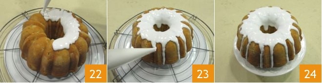 Transferid la glasa a una manga pastelera y, cuando la bundt cake esté bien fría, colocad una bandeja debajo de la rejilla (servirá para recoger la glasa que se derrame antes de secarse); decorad el pastel cubriendo uniformemente la parte superior 22 y dibujando líneas verticales cerca de las ranuras laterales, comenzando desde arriba y bajando con la manga pastelera a lo largo de cada ranura del pastel 23 o cread un motivo decorativo a vuestro gusto; como alternativa a la manga pastelera, podéis usar una cucharita. Una vez seca la glasa, vuestra fragante bundt cake está lista para ser disfrutada 24!