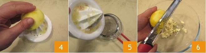 Exprimid el zumo de limón 4 y filtradlo a través de un colador 5 (necesitaréis 45 g para la masa y 20 g para la glasa), luego precalentar el horno a 170° en modo estático. En otro bol grande, añadid la mantequilla ablandada en trozos y rallad directamente en el bol la cáscara de 2 limones, teniendo cuidado de solo coger la parte amarilla de la piel 6.