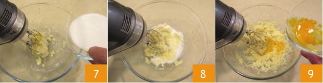 Trabajad la mantequilla con las varillas eléctricas a velocidad media-baja hasta reducirla a pomada; una vez alcanzada esta consistencia, añadid el azúcar poco a poco 7, continuando batiendo con las varillas durante unos 3-4 minutos, siempre a velocidad media-baja 8. Luego verted los huevos a temperatura ambiente, uno por uno 9,