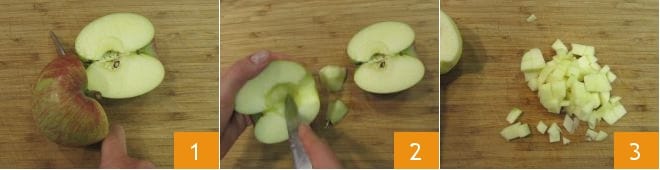Para realizar los buñuelitos de manzana y ricotta, lo primero que hay que hacer es cortar las manzanas por la mitad 1, eliminar el corazón central 2 y pelarlas. En este punto, redúcelas a cubitos de aproximadamente 1 cm 3.