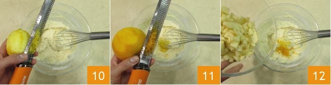 Mezcla para incorporar estos ingredientes y luego aromatiza la masa con la ralladura de limón 10 y la de naranja 11. Añade los cubitos de manzana 12.
