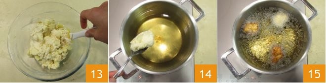 Y mezcla para distribuirlos dentro de la masa. La mezcla está lista para la cocción 13. Coloca en el fuego un cazo de borde alto y vierte en su interior el aceite de semillas. Calienta el aceite y cuando haya alcanzado los 160°, sumerge una cucharada de masa 14. Cocina pocos buñuelos a la vez durante unos 8 minutos 15 y cuando se vuelvan dorados,
