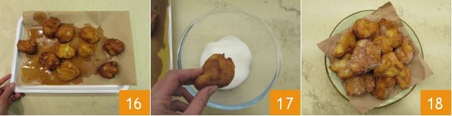 escúrrelos en una bandeja cubierta con papel absorbente 16 y déjalos templar. Para terminar, pásalos por el azúcar 17 y sirve bien calientes los buñuelitos de manzana y ricotta 18.