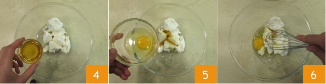 Vierte en un bol la ricotta bien escurrida de su suero, la miel 4, el huevo entero 5 y mezcla con un batidor 6.