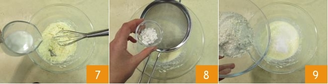 Añadir ahora la leche 7, la levadura tamizada 8 y la harina 9.