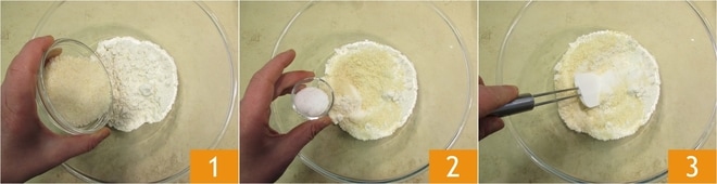 Para preparar las tortitas de calabacín crujientes, primero vierte en un bol la harina, el queso parmesano 1 y la sal 2. Mezcla los ingredientes secos con una espátula 3,