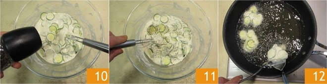 Añade la pimienta negra 10 y mezcla de nuevo 11. En una sartén grande, pon a calentar el aceite. Tan pronto como alcance una temperatura de 170°, con la ayuda de dos cucharas, sumerge un poco de la mezcla en el aceite para formar las tortitas 12. Fríe poco a poco, para no bajar la temperatura del aceite.
