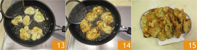 Fríe durante 2-3 minutos, luego gira las tortitas 13, termina la cocción por otros 2-3 minutos y, con una espumadera, escúrrelas 14 en una bandeja con papel absorbente. Continúa con la cocción de las demás y sírvelas aún calientes 15.