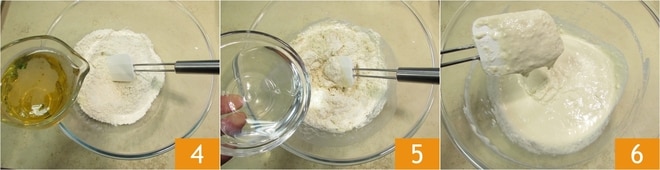y continuando mezclando, añade la cerveza 4 y el agua 5. Debes obtener una mezcla suave, sin grumos 6.