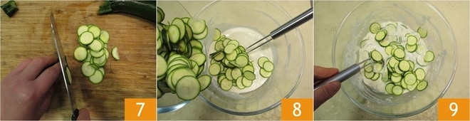 Lava los calabacines, quítales los extremos y córtalos en rodajas de un par de mm de grosor 7. Colócalos en la mezcla recién preparada 8 y mezcla para integrar todo 9.