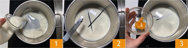 Para preparar los buñuelos de Carnaval, comenzad con la crema pastelera: verted en un cazo la leche 1 y aromatizadla con la vaina y las semillas de una vaina de vainilla 2. Añadid también la piel de media naranja 3 y llevadla a rozar el hervor.<\/p>