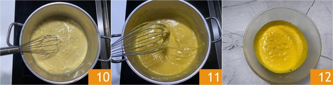 Cocinad a fuego medio removiendo continuamente con una batidora 10 hasta alcanzar la consistencia deseada 11; tomará alrededor de 6 minutos. Transferid la crema pastelera a un bol, cubrid con film a contacto y dejad enfriar 12, luego transferidla a una manga pastelera con boquilla lisa.<\/p>