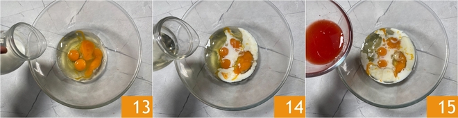 Mientras tanto, ocupaos de la masa de los buñuelos: verted los huevos en un bol junto con la leche 13, el aceite de semillas 14 y el zumo de naranja 15.<\/p>
