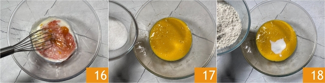 Mezclad los ingredientes líquidos con una batidora 16. Ahora unid los ingredientes secos: el azúcar 17 y la harina 00 18.<\/p>