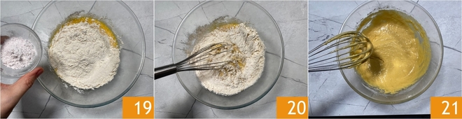 Añadid también la levadura para postres 19 y mezclad con una batidora 20 para integrar bien todos los ingredientes prestando atención también a los bordes del bol 21.<\/p>