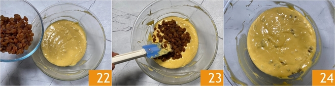 Ahora verted en la masa las pasas 22 y mezclad con una espátula 23 para incorporarlas de manera uniforme 24.<\/p>