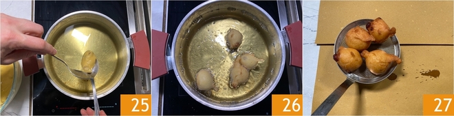 Estáis listos para freír: calentad el aceite de semillas a 160° y con la ayuda de 2 cucharas dejad caer la masa en la olla 25; para hacer esta operación más fácil, podéis sumergir previamente las cucharas en el aceite caliente. Freíd como máximo 4 buñuelos a la vez para evitar que la temperatura del aceite baje 26. Cuando estén bien dorados, tomará 4-5 minutos, escurrid los buñuelos en papel absorbente 27.<\/p>