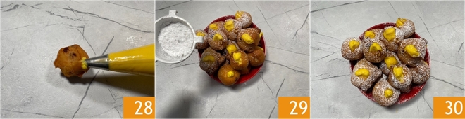 En este punto, retomad la crema pastelera enfriada, perforad la base de los buñuelos con la ayuda de un palillo y rellenadlos insertando la boquilla de la manga pastelera en el agujero 28. Espolvoread con azúcar glas al gusto 29 ¡y vuestros buñuelos de Carnaval están listos para ser disfrutados 30!<\/p>