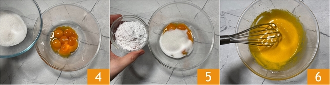 En un bol aparte unid las yemas, el azúcar 4 y el almidón de arroz 5, luego mezclad bien con una batidora para integrar todo 6.<\/p>