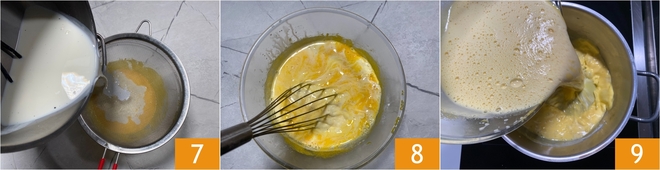 Verted en el bol la leche caliente filtrada con un colador 7 y mezclad suavemente para integrar 8, luego volved a poner la mezcla en el cazo 9.<\/p>