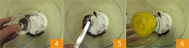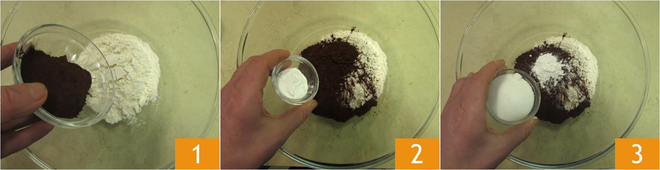 Para preparar las castagnole al chocolate, pon la harina y el cacao en un bol grande 1, la levadura 2 y el azúcar 3.