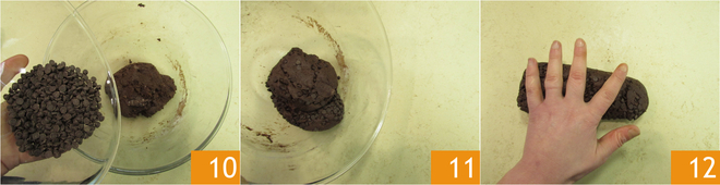 Por último, incorpora las chispas de chocolate 10. Amasa todo, transfiere la masa a una superficie de trabajo 11 y forma un cilindro 12.