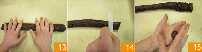 Enróllalo 13 y corta en piezas de 12-13 g cada una 14. Forma bolitas redondas con las manos 15.