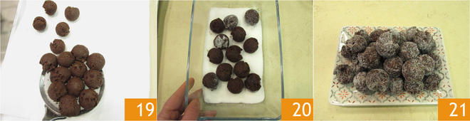 Colócalas a medida que las sacas en una bandeja forrada con papel absorbente de cocina 19. Una vez terminado de freír, enrolla las bolas en azúcar granulada 20. ¡Tus castagnole de chocolate están listas 21!