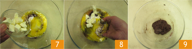 una pizca de sal y la mantequilla blanda 7, amasa todo con las manos hasta obtener una masa compacta y homogénea 9.