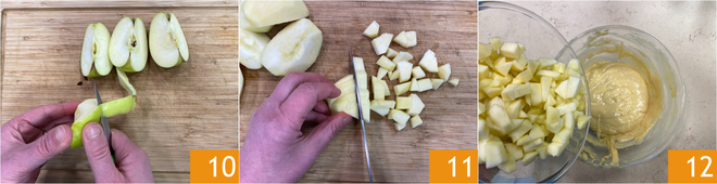 Pase a las manzanas: pélelas 10 y córtelas primero en rodajas finas y luego en cubos de 1 cm 11; necesitará unos 300 g de pulpa. Agregue las manzanas a la masa 12 e incorpórelas con una cuchara 12.