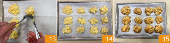 Con la ayuda de 2 cucharas, forme montoncitos de masa en una bandeja forrada con papel de horno, manteniéndolos separados entre sí; con estas cantidades obtendrá alrededor de 20 13. Hornee en horno estático precalentado a 200° durante unos 20 minutos 14. Cuando estén dorados, deje enfriar sus buñuelos de manzana al horno 15 y disfrútelos, si lo desea, con un poco de azúcar glas por encima 15.